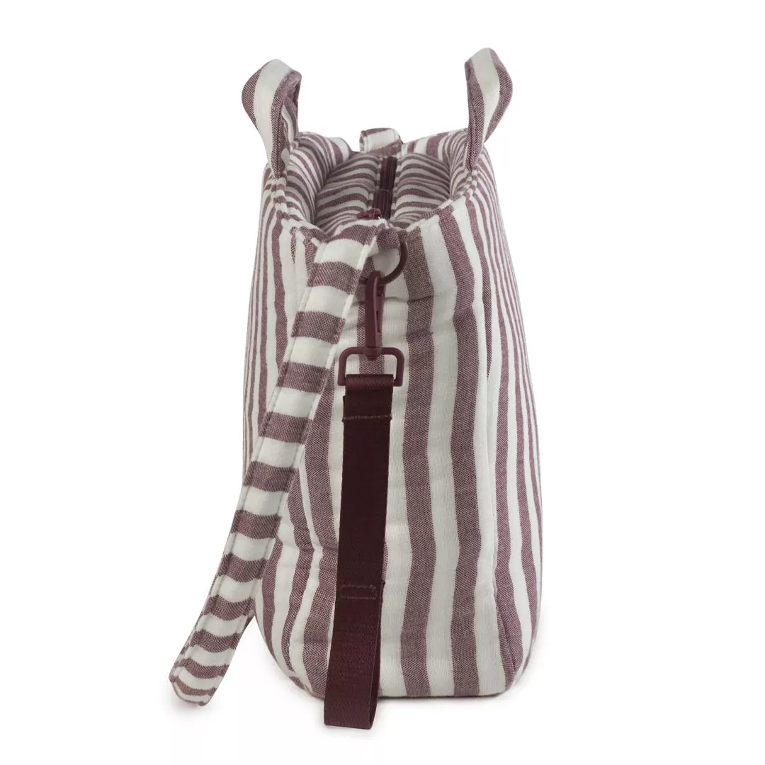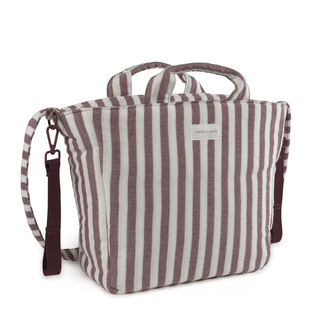 La bolsa canastilla Cherry Rayas Burdeos de Pasito a pasito es un modelo único para carrito de bebé o el bolso para silla de paseo, elaborado en algodón 100% con un delicado tejido de rayas