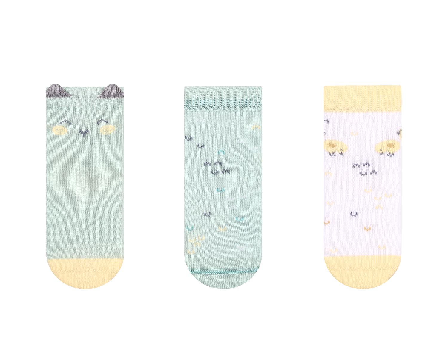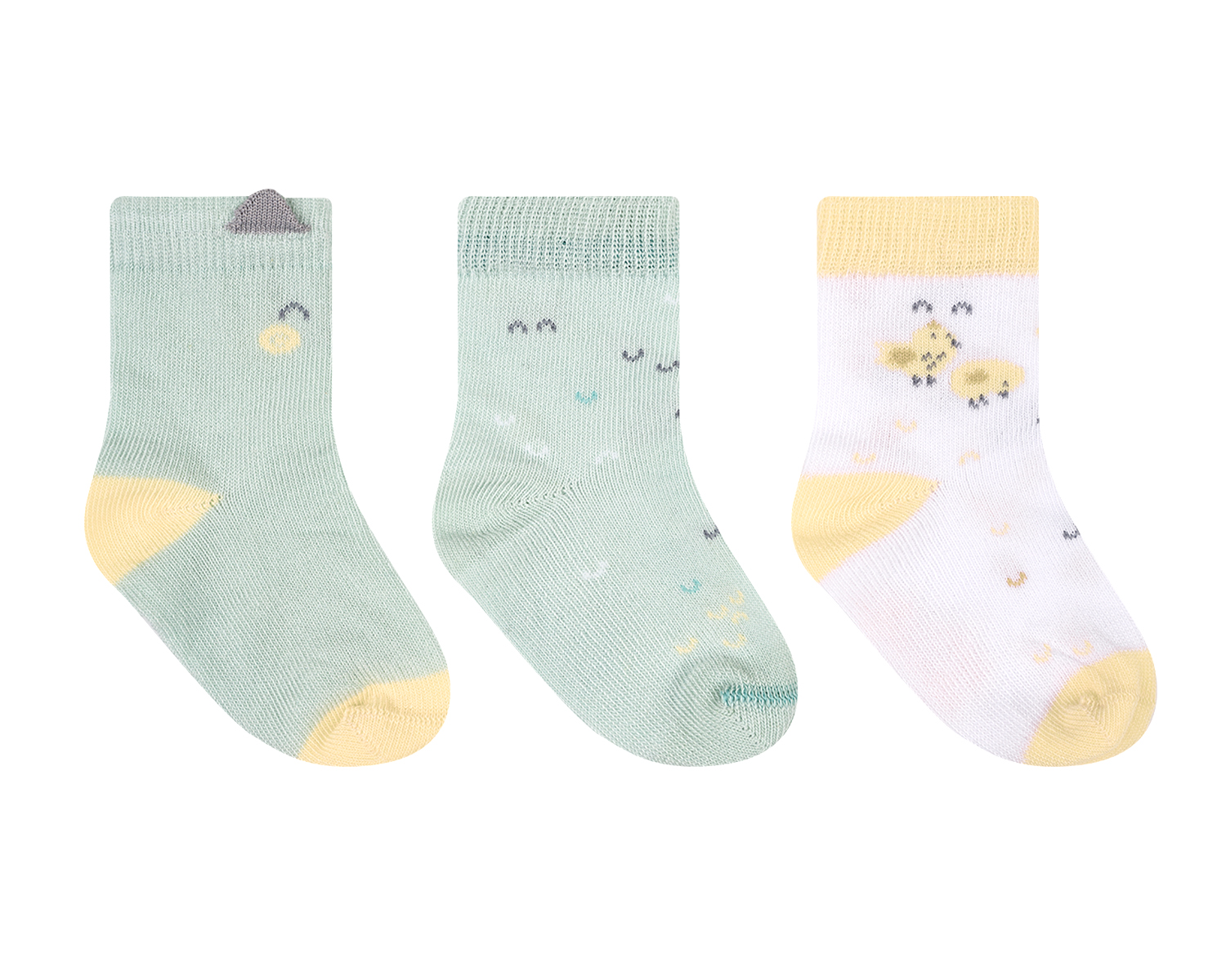 • Juego de 3 pares de calcetines suaves para bebés con un diseño elegante en colores suaves;• Juguetones detalles en las orejas en 3D;• Material transpirable y elástico de primera calidad;• Contenido: 85% algodón, 10% poliamida, 5% elastano;• Fabricados en la UE. Â
