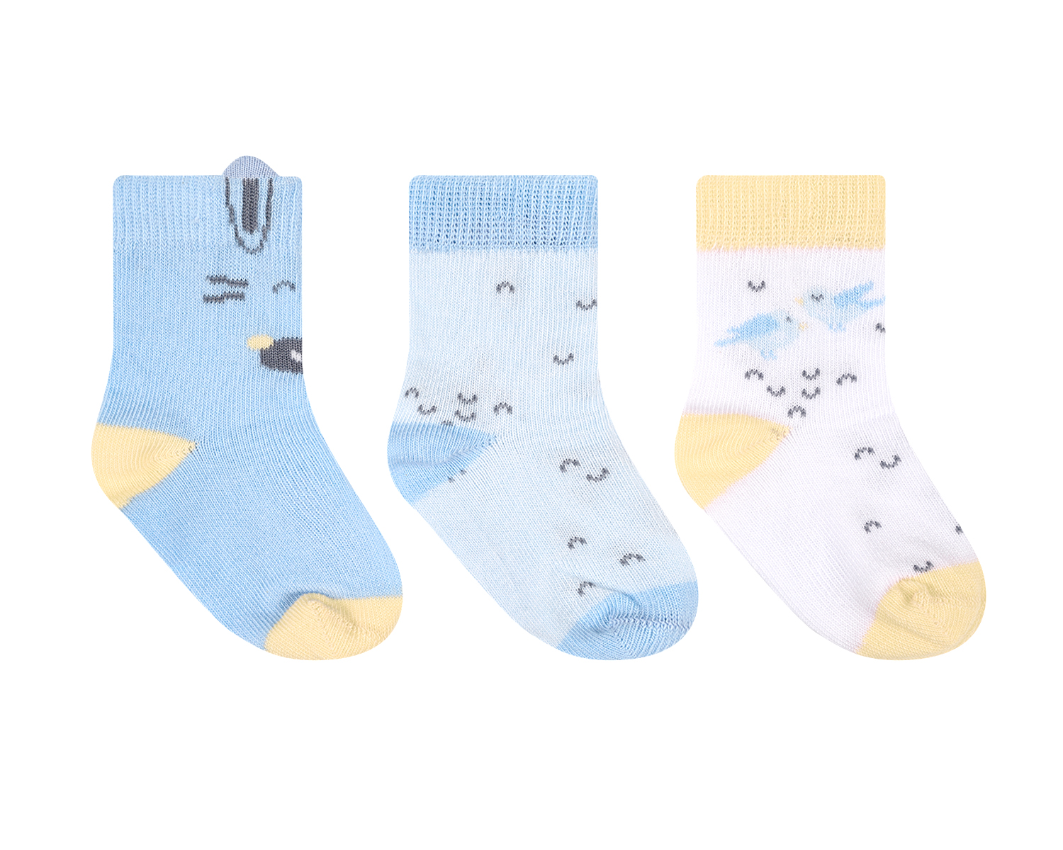 • Juego de 3 pares de calcetines suaves para bebés con un diseño elegante en colores suaves;• Juguetones detalles en las orejas en 3D;• Material transpirable y elástico de primera calidad;• Contenido: 85% algodón, 10% poliamida, 5% elastano;• Fabricados en la UE. Â